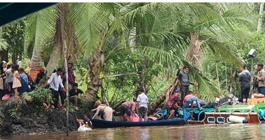Speedboat yang mengangkut puluhan orang menuju sungai Guntung ini karam dan harus menepi. Foto-foto evakuasi penumpang speedboat yang yang dikabarkan selamat beredar dimedsos.