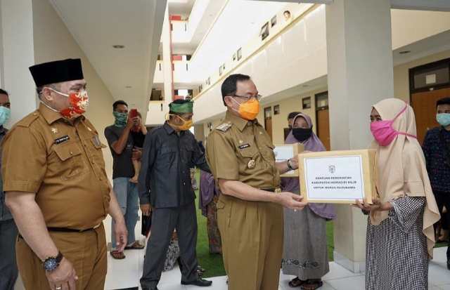 Selain menyampaikan kabar gembira tersebut, Bupati Wardan juga menyerahkan sembako kepada para penghuni Rusunawa Sejuta Kanal.