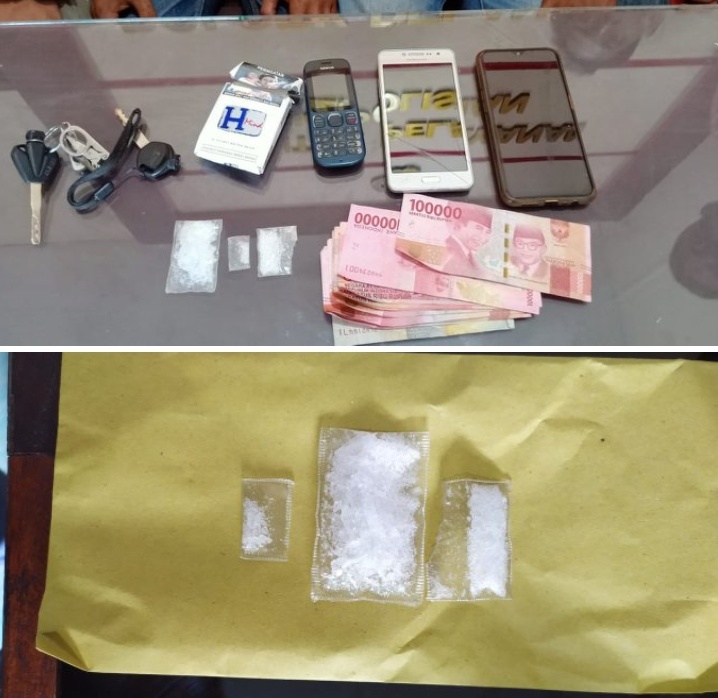 Dari tangan pelaku berhasil diamankan barang bukti, 3 paket Narkotika jenis sabu, uang tunai Rp. 1.000.000,-( Satu juta rupiah) dengan pecahan seratus dan 3 unit handphone.
