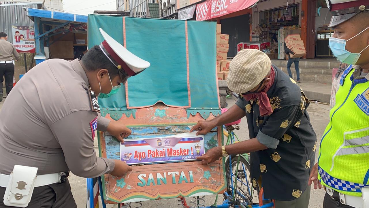 Satlantas Polres Inhil menargetkan angkutan umum berupa becak dayung untuk dipasangi stiker ‘Ayo Pakai Masker’. Selain itu, stiker tersebut juga dipasang pada kendaraan perpustakaan keliling dan angkutan barang.