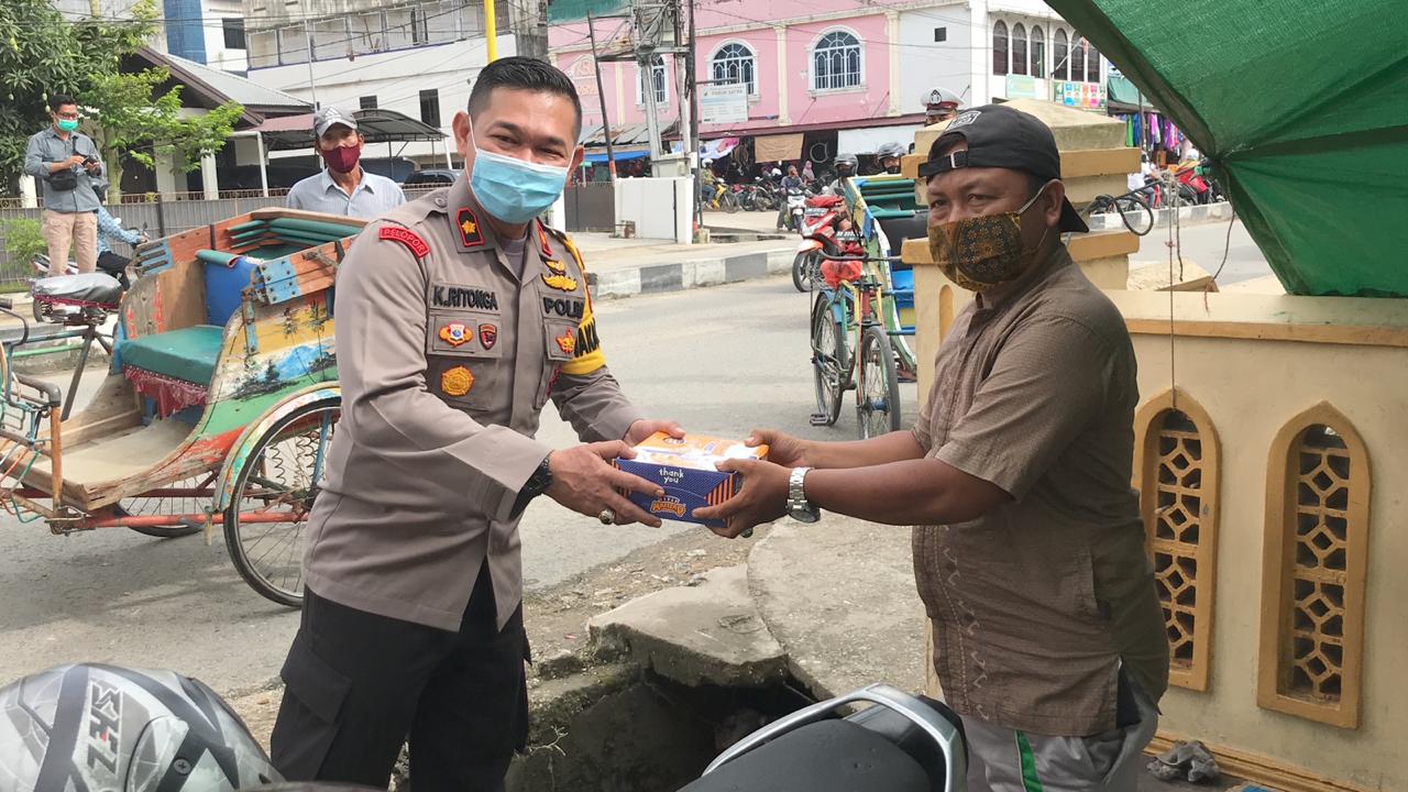 Kapolres Inhil AKBP Dian mengatakan kegiatan Jumat berkah berbagi nasi kotak gratis kali ini dengan sasaran tukang becak dan tukang ojek.