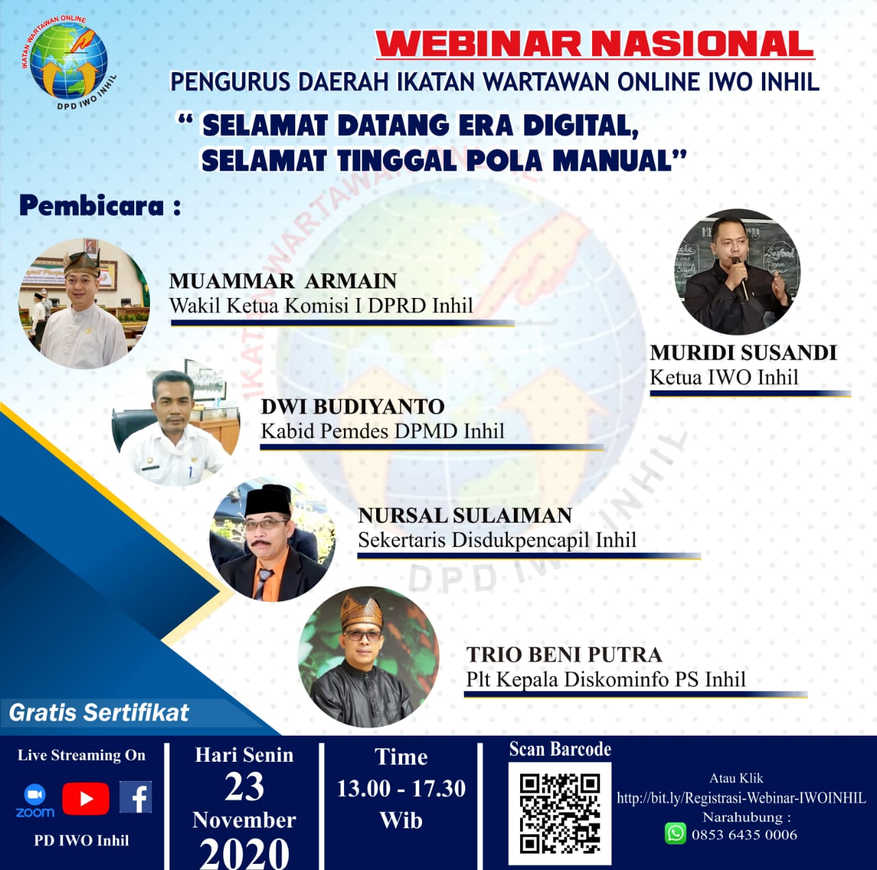 Infoinhil.com – Bupati Kabupaten Indragiri Hilir (Inhil), HM Wardan dan Ketua Umum Pengurus Pusat Ikatan Wartawan Online (IWO), Jhodi Yudono akan menghadiri kegiatan Webinar Nasional yang ditaja Pengurus Daerah IWO Inhil pada Senin, 23 November 2020.