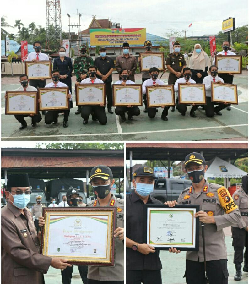 Selain Bupati Inhil dan Ketua DPRD, Kapolres Inhil AKBP Dian Setyawan dan Ketua Granat Zakaria turut memberikan penghargaan kepada 9 personel Polres Inhil yang berprestasi.