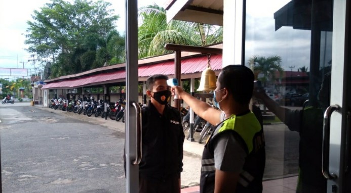 INHIL- Di hari libur pun Polres Inhil tetap ketat dalam menerapkan protokol kesehatan bagi personelnya yang melaksanakan dinas dengan melakukan pengukuran suhu tubuh dan sterilisasi, hal ini dilakukan kepada personel yang bertugas di pos jaga maupun di dalam ruangan sebagai antisipasi penyebaran virus Covid-19.