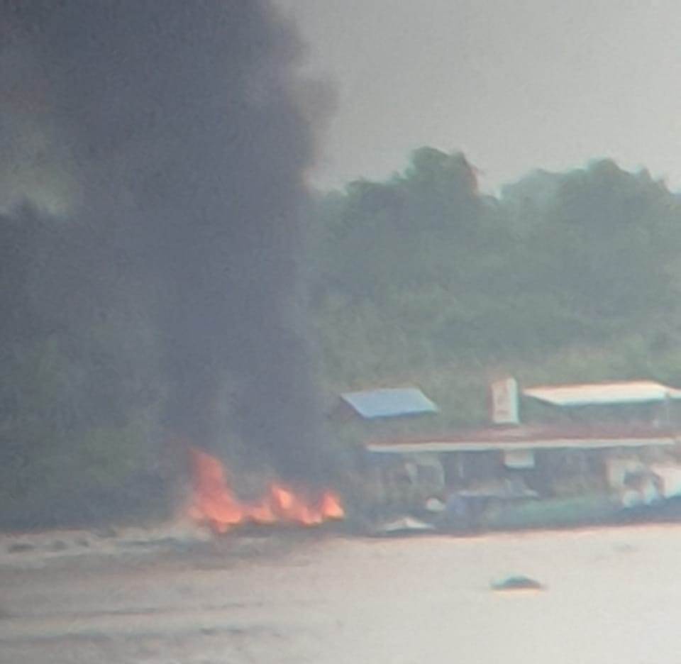 kapal motor yang terbakar berada di perairan sungai Indragiri tepatnya di seberang Tembilahan, dari kota Tembilahan tampak kelihatan api membara.