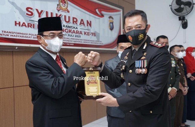 “Selamat HUT Bhayangkara ke-75, semoga sinergisitas antara Polri dengan TNI dan jajaran Pemerintah Daerah Kabupaten Indragiri Hilir tetap terjaga dan kedepannya dapat lebih ditingkatkan lagi terutama di dalam mengatasi penyelesaian pandemi Covid-19 khususnya di wilayah Kabupaten Indragiri Hilir,” ucap Bupati.