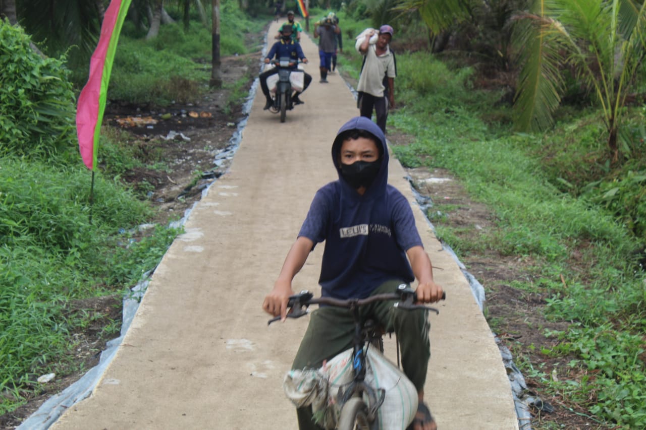 Jalan penghubung Desa Terusan Beringin Jaya dengan Desa Teluk Bunian yang volumenya 558 meter x 2 meter x 0,12 meter sudah mencapai hasil 520 meter atau sekitar 93,18 persen