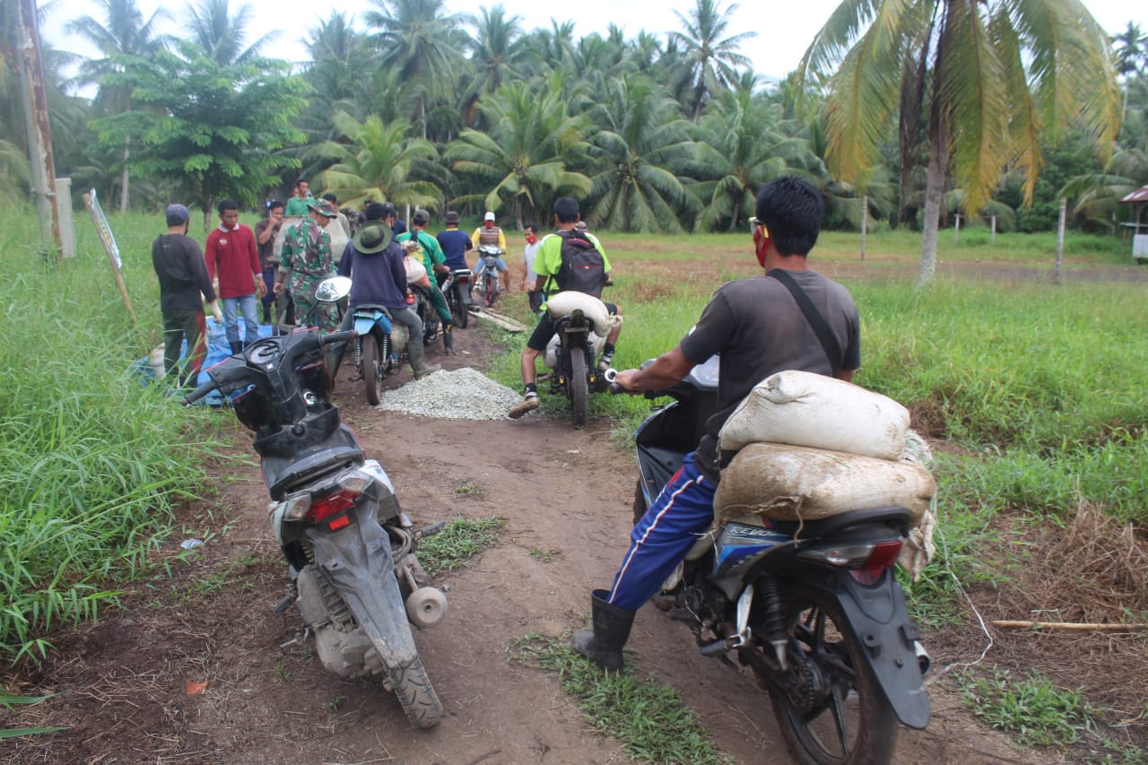 Hal ini menandakan sudah dimulainya kegiatan gotong royong semenisasi jalan penghubung antara Desa Terusan Beringin Jaya dengan Desa Teluk Bunian yang sedang di kerjakan oleh Satgas TMMD bersama masyarakat. Kamis, (01/07/2021).