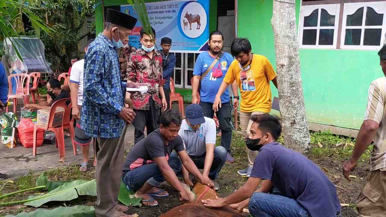 Usai doa bersama, PD IWO Inhil melaksanakan pemotongan hewan kurban dibantu warga sekitar lokasi Sekretariat PD IWO Inhil.