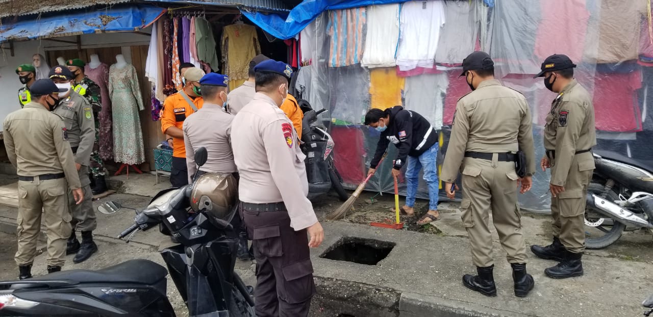 Tim Satgas Penanganan Covid Inhil, terdiri dari TNI Polri, Satpol PP, Dishub, bersama hakim, panitera melakukan penindakan di Pasar Air mancur jalan Sudirman Tembilahan.