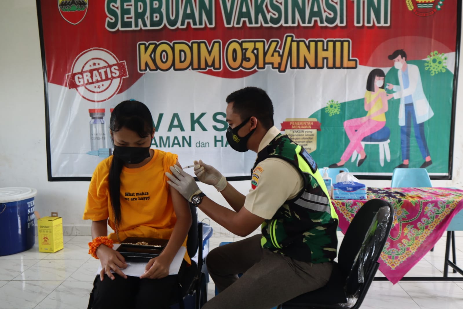 “Alhamdulillah hari ini Kodim 0314/Inhil melaksanakan serbuan Vaksinasi TNI yang dilakukan oleh tim vaksinator Poskes Kodim 0314/Inhil di Wilayah terpencil yang terletak di Desa Teluk Merbau kecamatan Gaung, yang di pasilitasi PT GIN kepada masyarakat dan para pelajar serta karyawan PT GIN,” ucap Dandim pada Rabu (29/9/2021) siang.