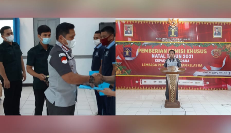 Bertempat di Aula Dr. Sahardjo Lapas Kelas IIA Tembilahan, Kepala Lapas Julianto Budhi Prasetyono menyerahkan Surat Keputusan (SK) pemberian remisi khusus Natal kepada WBP yang memperolehnya, Sabtu (25/12/2021).