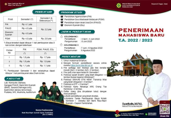 Untuk informasi lebih lanjut mengenai pendaftaran mahasiswa baru di STAI Auliaurrasyidin Tembilahan dapat menghubungi di nomor 0822 8565 4848 dan atau 0812 6660 0502.