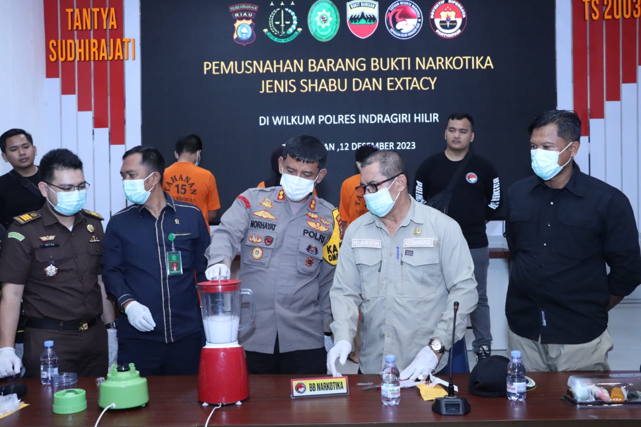 Kapolres Inhil, AKBP Norhayat, S.IK memimpin langsung kegiatan pemusnahan dengan menghancurkan barang bukti menggunakan blender yang dicampur dengan air keras.