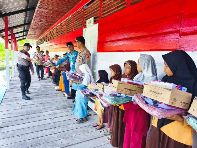 Bantuan diserahkan secara simbolis oleh Kapolsek Kuala Indragiri kepada kepala sekolah SDN 020 Sapat, kemudian dibagikan kepada siswa.